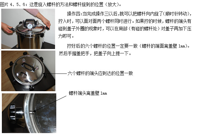 c 適當(dāng)退出已經(jīng)擰在滅菌器桶口邊上的膠木螺釘,使螺釘端頭離開(kāi)器蓋的邊緣,然后小心提起器蓋。切勿使用提拉放汽管的方法提起器蓋。